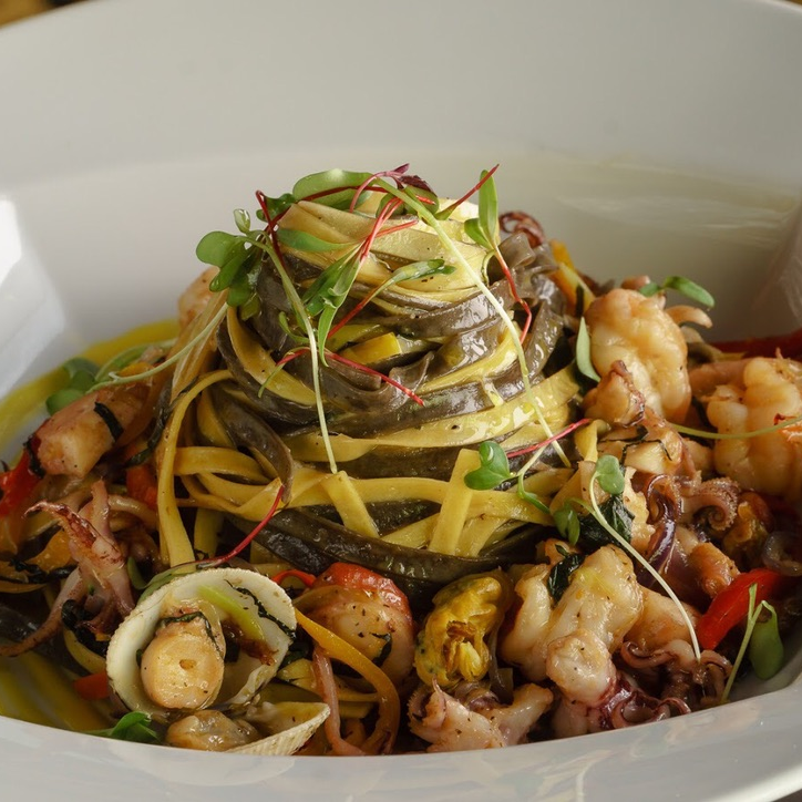 Pomodoro sauce, mozzarella, and sautéed seafood.