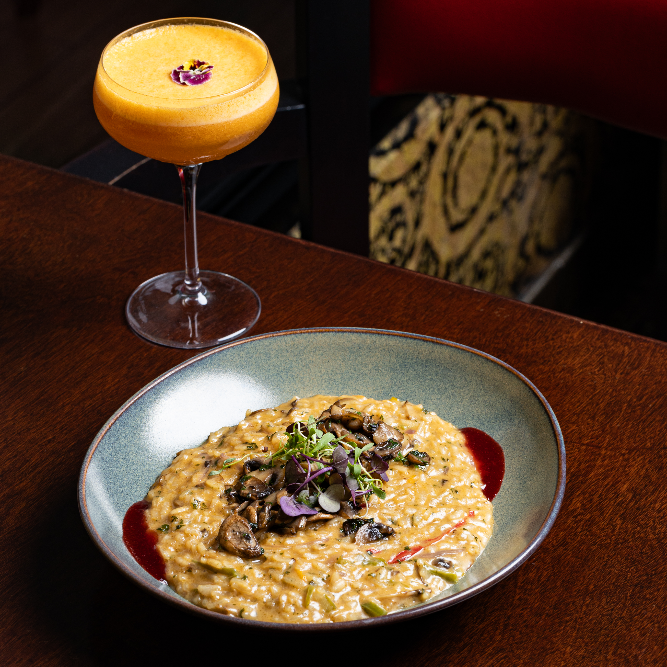 Varnished with a light aromatic oil, confit and fresh mushrooms, pico de gallo, Grana Padano shavings, arugula, a sprinkle of puffed rice, avocado coulis, herb mayo, and basil pesto dressing.