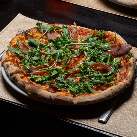Filled with cream cheese and prosciutto, topped with a drizzle of truffle oil and arugula.