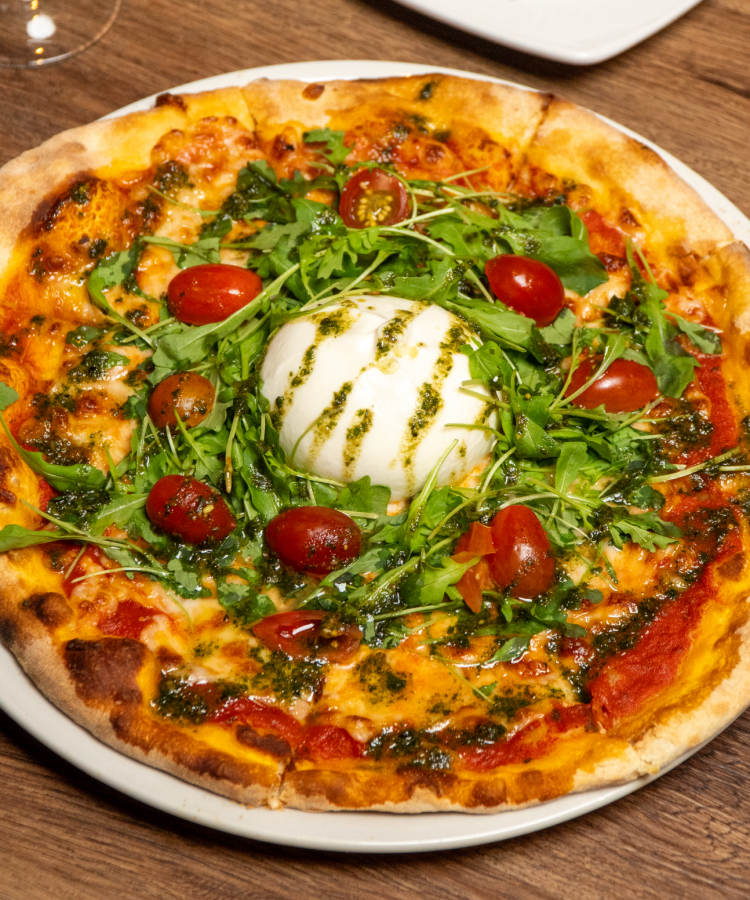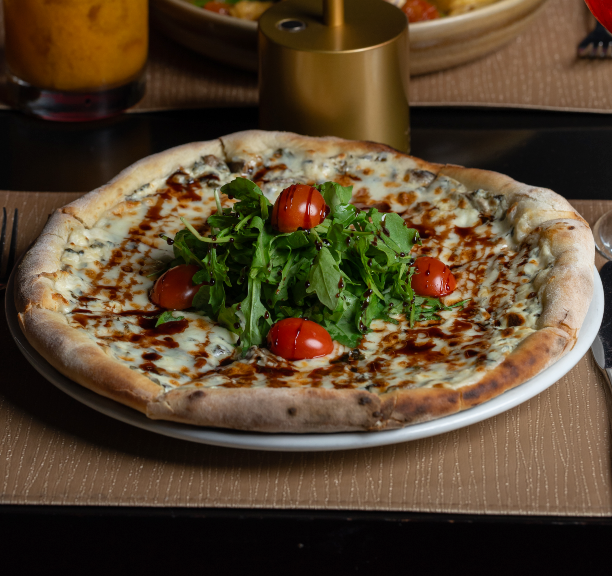 Confit mushrooms, Kalamata olives, roasted tomatoes, pomodoro sauce, infused with truffle oil, basil pesto, arugula, and bocconcini cheese.