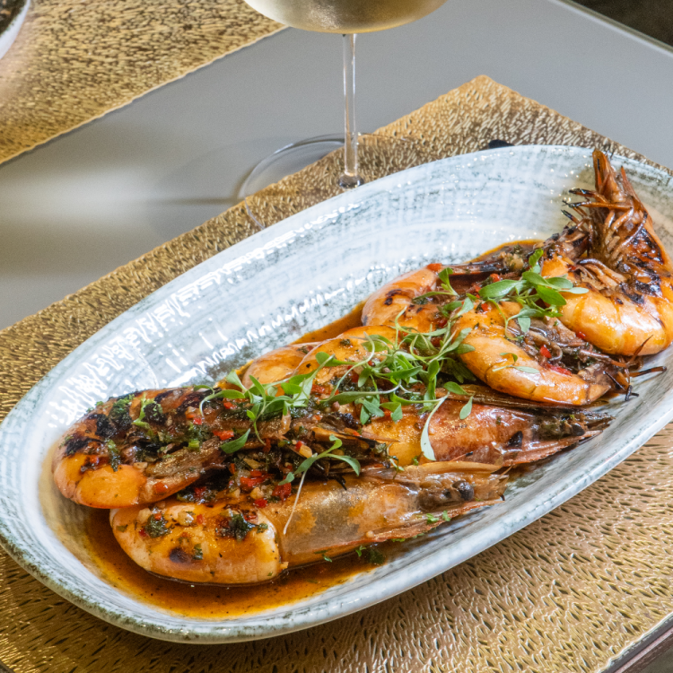 Gamberoni with garlic and red sweet pepper, finished with a refined touch of bisque and white wine.