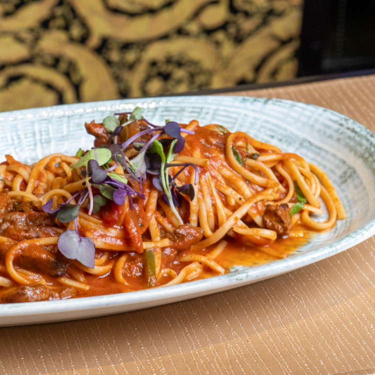 Strips of Tenderloin steak, roasted tomato, pepper, red onion, pomodoro sauce and fresh basil.