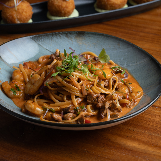 Sautéed seafood with bell pepper, red onion, and cilantro, served on a bed of orange reduction, topped with orange supremes and a drizzle of black sesame.