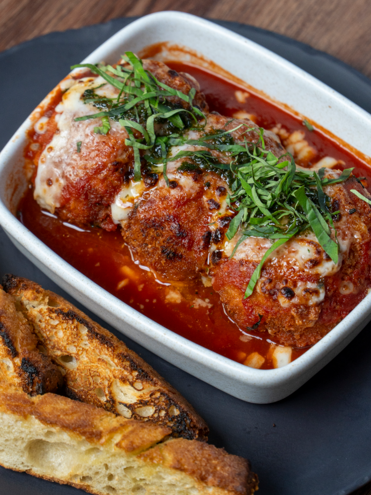 Thin slices of crispy eggplant, filled with ricotta, roasted tomatoes and cream cheese. Topped with Pomodoro sauce and au gratin with mozzarella.