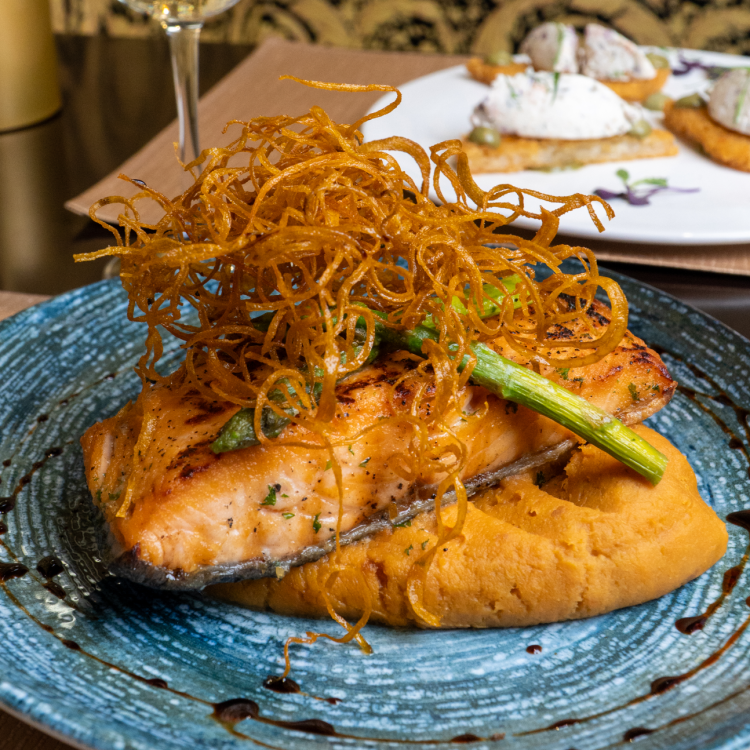 Smoked salmon combined with dill, capers, chives, and special cream. Served on a crispy potato base with avocado coulis.