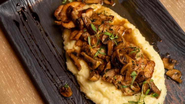 Grilled chicken breast with sautéed mushrooms served over mashed potatoes.
