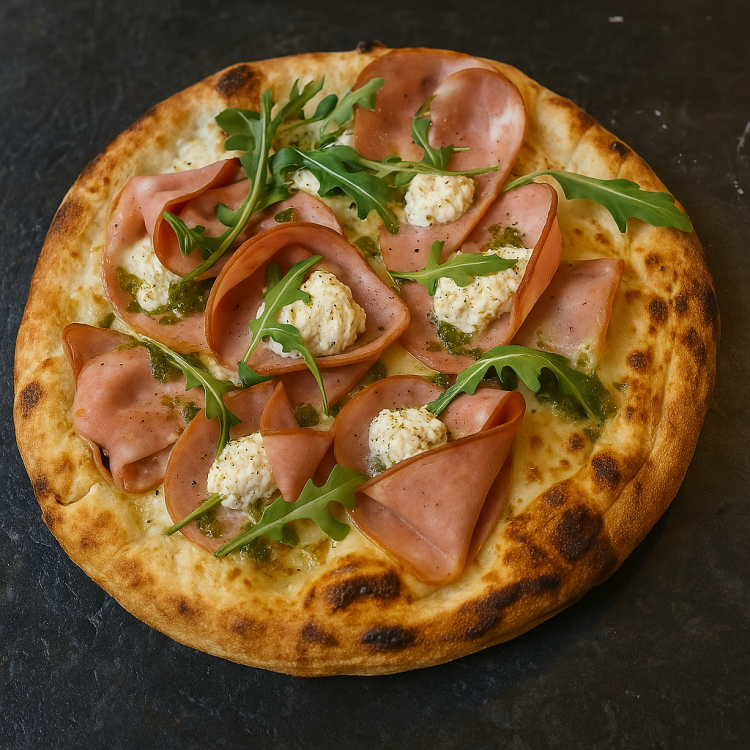 Cacio e pepe, Italian mortadella, stracciatella, pistachio pesto, pistachio powder, and arugula.