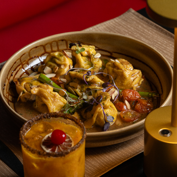 Ravioli clásico hecho en casa, crema, champiñones y vino blanco,coronados con supremas de naranja, tartar de vegetales, almendras fileteadas y pesto de albahaca.